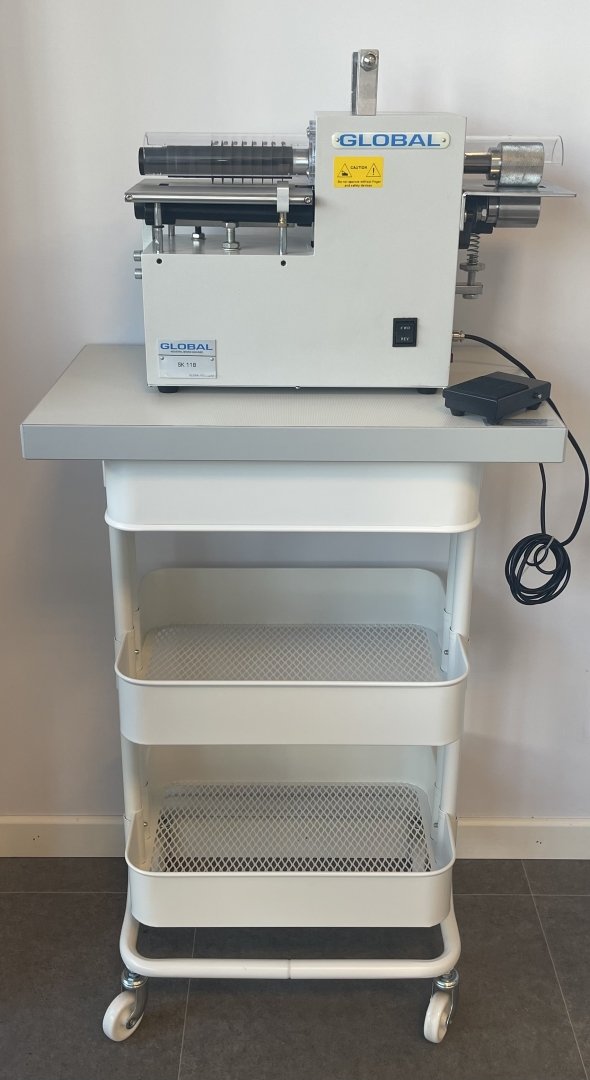 GLOBAL SK 118 - Elektrische riemen snijmachine voor het perfect en moeiteloos recht snijden van lederen riemen. Machine beschikt over verschillende messen welke door middel van afstandsbussen op de gewenste snijbreedtes kunnen ingesteld worden. Zo kan men de messen plaatsen zodat er meerdere breedtes tegelijk gesneden kunnen worden, bijvoorbeeld: 15mm, 20mm, 25mm en 35mm. Maximaal 8 snijmessen (7 snijbreedtes) te verdelen over een werkbreedte van 115mm. Rechts aan de machine bevind zich een drukwals om verlijmde riemen aan te drukken indien nodig. Machine wordt aangedreven door en krachtige elektrische motor met vaste snelheid bediend door een voetpedaal, draairichting is omschakelbaar. Machine is draagbaar (18kg) en kan op een stevige tafel geplaatst worden of op een optioneel verkrijgbare trolley met werkblad van 35x55cm. Aansluiting op gewoon stopcontact 230V.