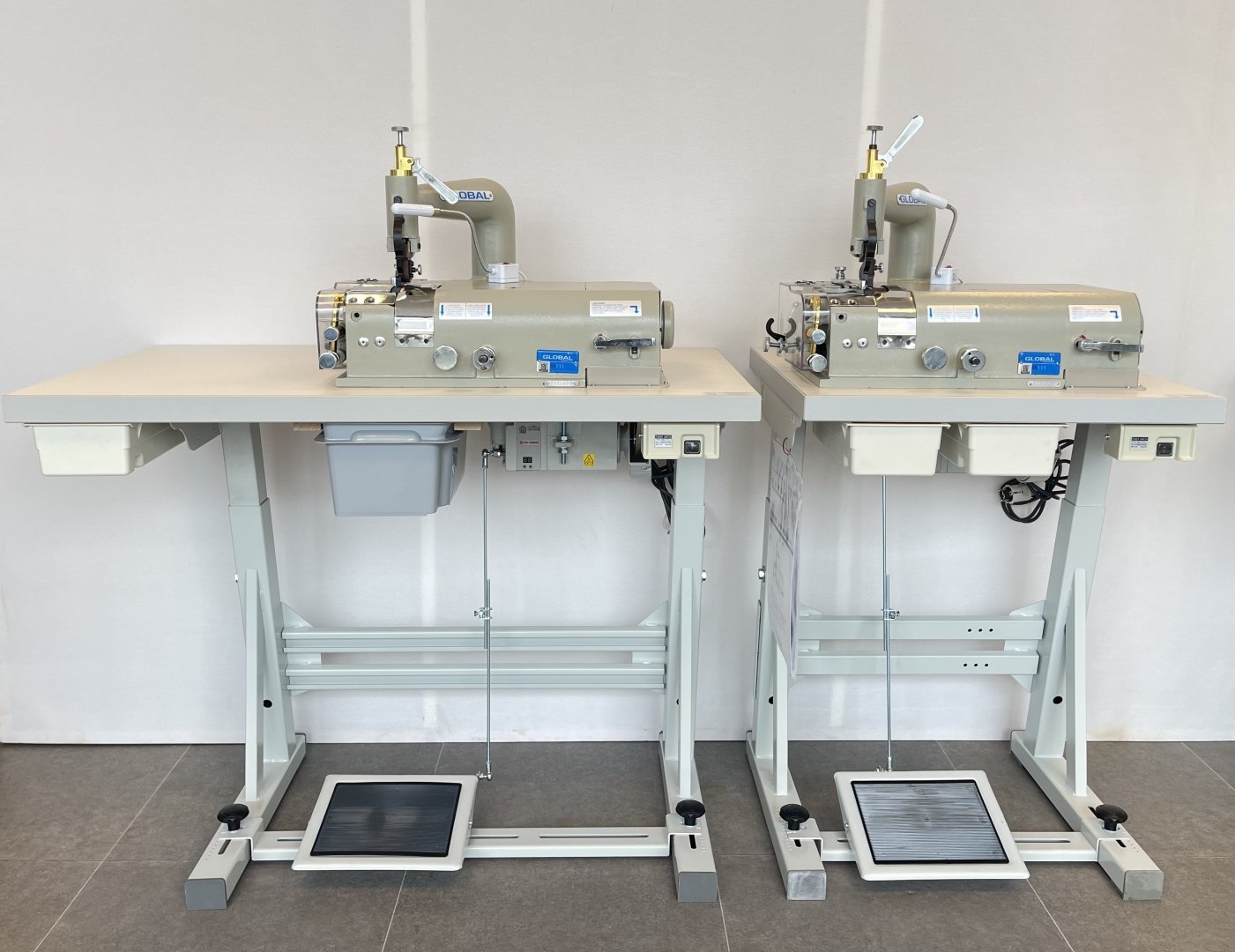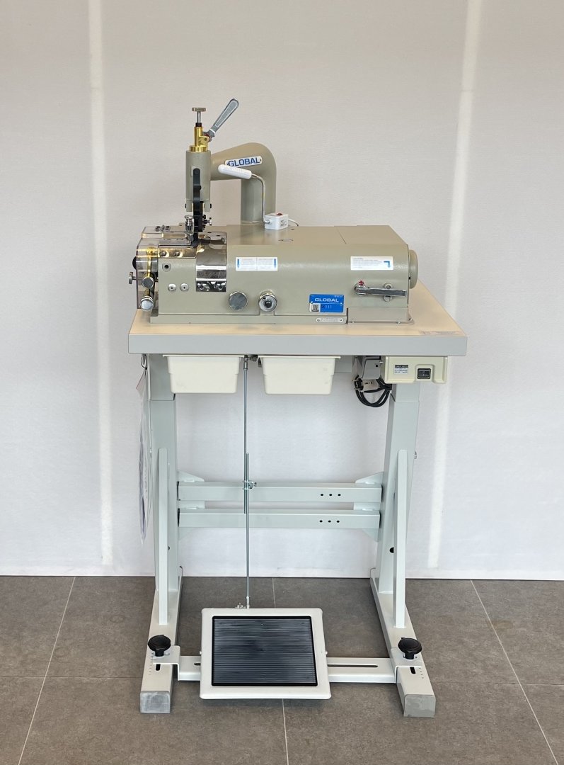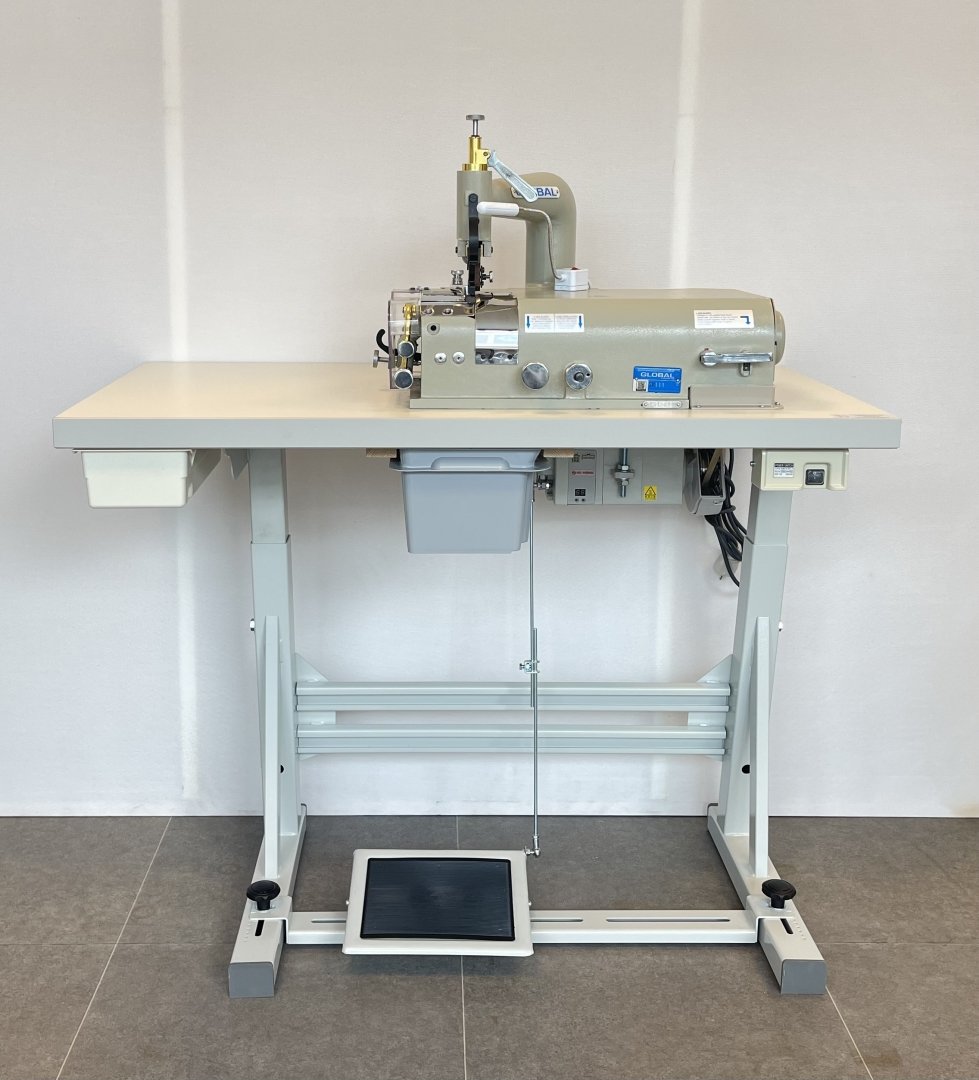 GLOBAL SK 111 - Schalmmachine voor het verdunnen van leder of kunstleder voor het maken van schoenen, tassen of riemen. Schalmbreedte instelbaar van 10 tot 50mm, geleverd met 2 schalmvoeten (50 en 30mm) en fijne transportrol (P120). Compleet met onderstel L80 en tafelblad 105x55cm, energiezuinige stappenmotor Ho-Hsing G60/600W/230V, opvangbakje voor schalmafval en ledverlichting.